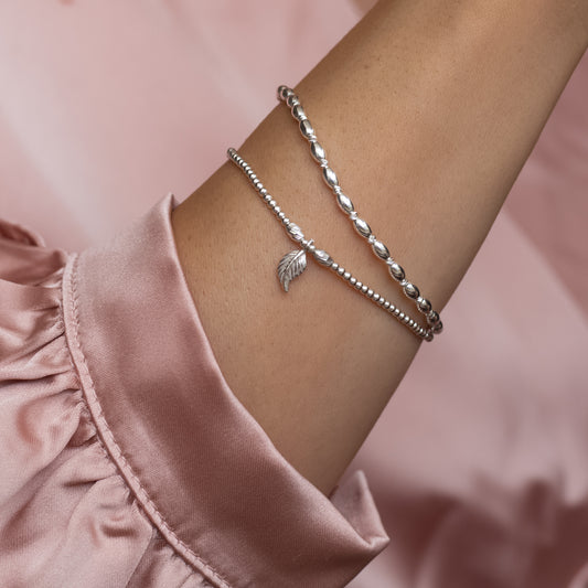 Minimalist Feather bracelet stack with dazzling multicut silver beads