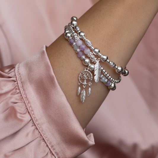 Boho Dreamcatcher bracelet stack with Aquamarine and Amethyst gemstone