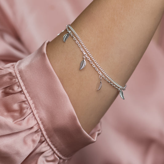 Delicate layered 925 sterling silver chain bracelet with tiny leaf charms