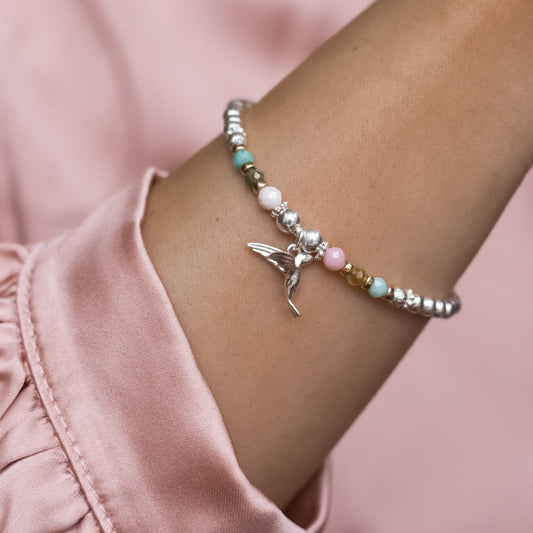 Luxury Hummingbird silver bracelet with Pink Opal, Green Garnet and Amazonite gemstones
