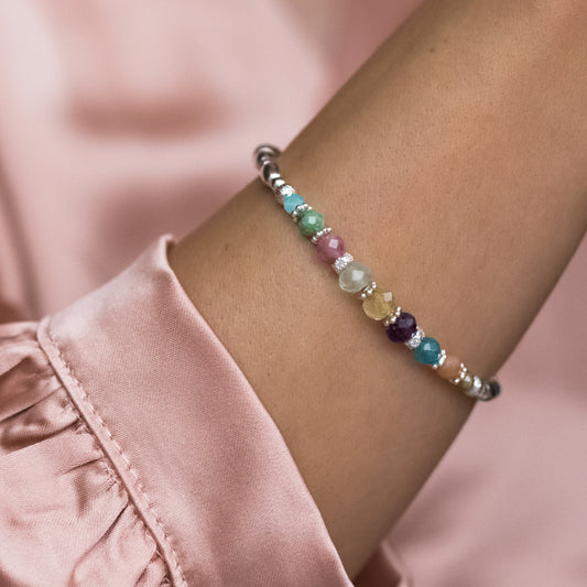 Colorful summer silver bracelet with Garnet, Tourmaline, Rutile Quartz, Fluorite and more