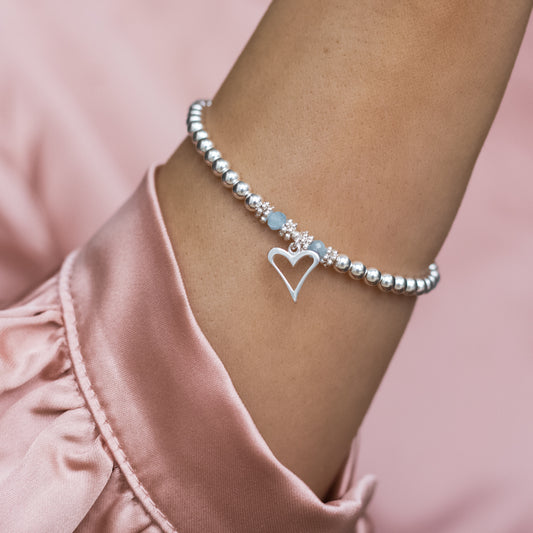 Romantic Heart silver stacking bracelet with Aquamarine gemstone