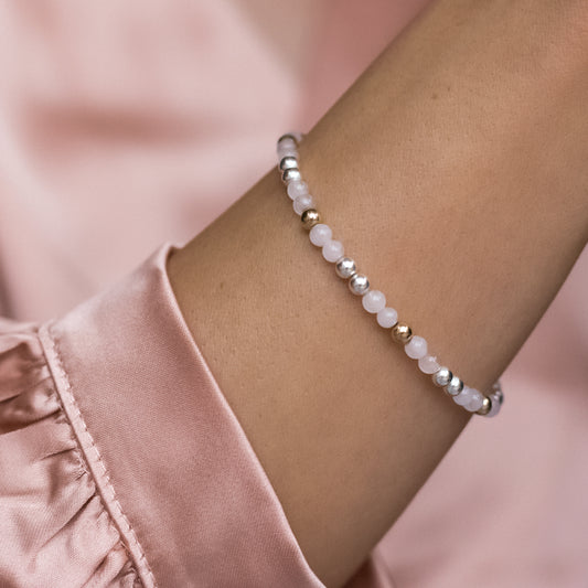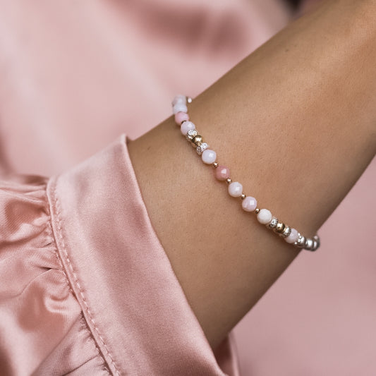 Romantic AAA quality Pink Opal stacking silver bracelet with 14k gold filled beads