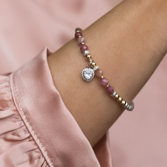 Luxury AAA Pink Tourmaline, silver and 14k gold stacking bracelet with Heart charm