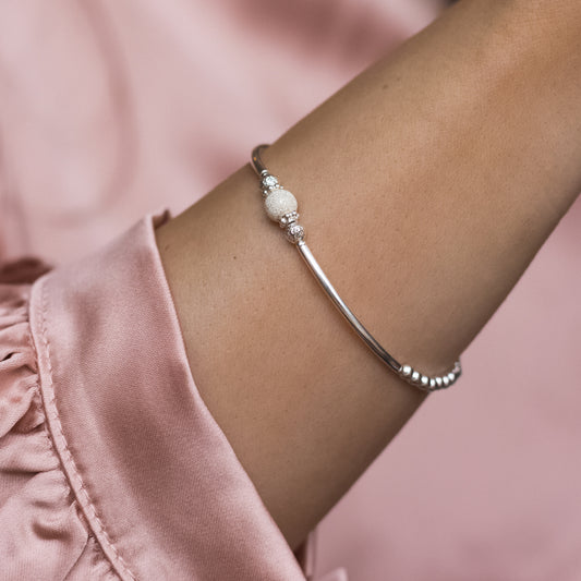 Elegant silver stacking bracelet with beautiful frosted ball
