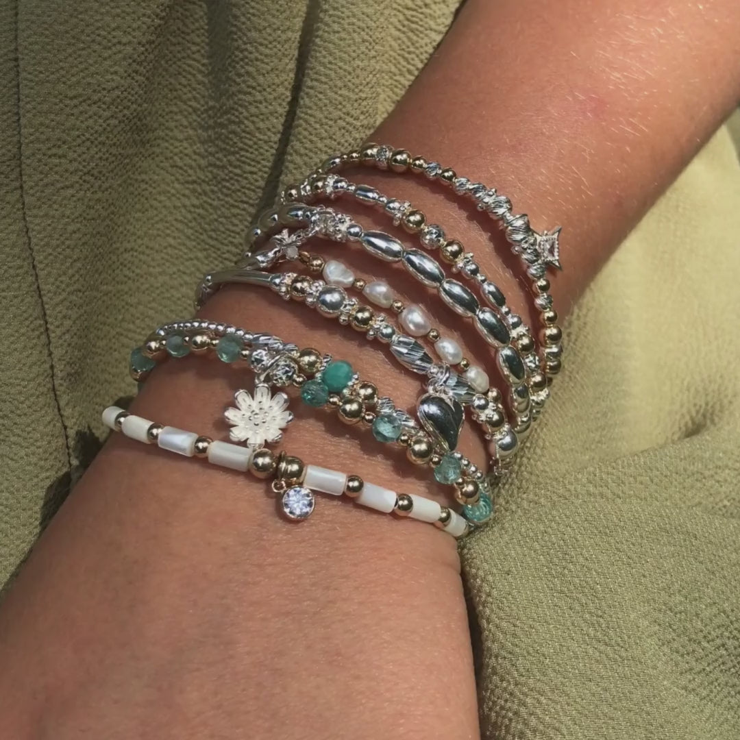 As it encircles her wrist, this bracelet conjures the image of fine lacework, adorning her in a tapestry of refined splendor. The 14k gold filled beads, gleaming with sophistication, mirror the intricate patterns of lace while infusing her style with a touch of regal allure.