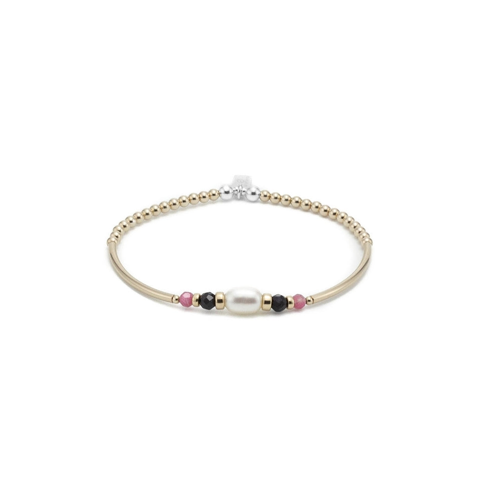 Elegantly crafted with sapphire, tourmaline, gold-beads and a freshwater pearls, this stacking bracelet exudes timeless sophistication.