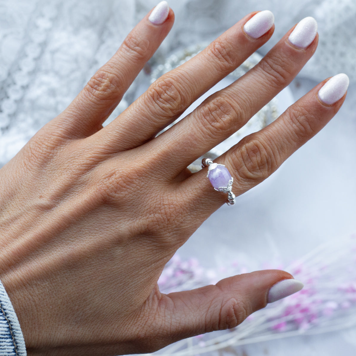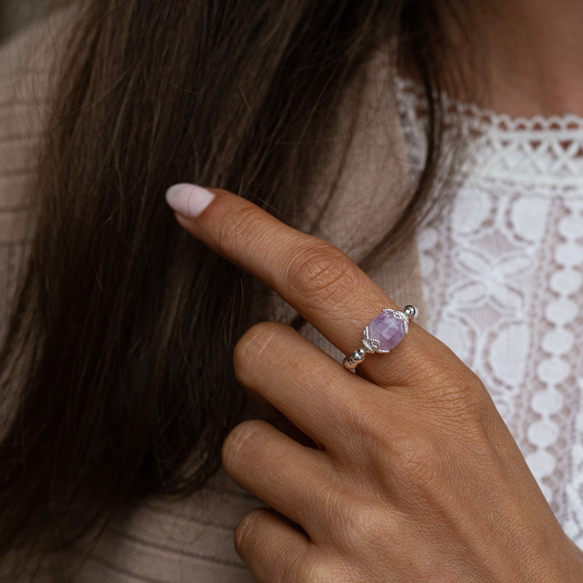 Radiating tranquility and spiritual awareness, the Aurora stacking ring showcases a captivating Amethyst gemstone. Known for its protective and healing properties, Amethyst encourages inner strength and emotional balance. It promotes clarity of mind, allowing the wearer to connect with their intuition and embrace a sense of peace. This ring serves as a reminder to trust one's instincts and remain grounded, embodying the essence of protection and serenity in every moment.