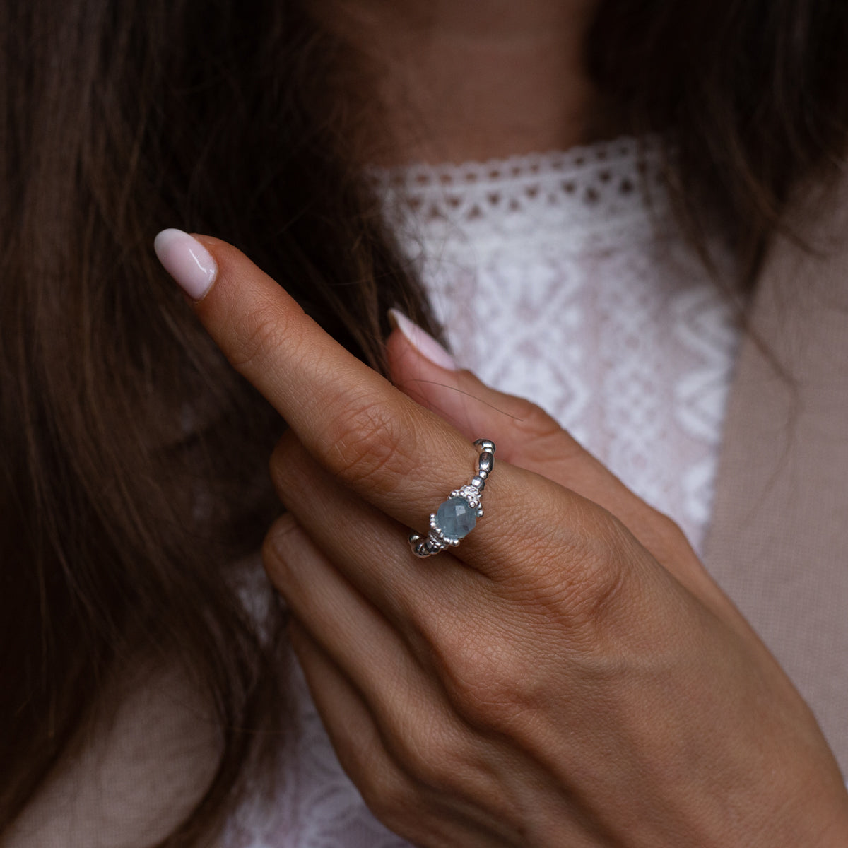 Embodying serenity and tranquility, the Celeste stacking ring features a stunning Aquamarine gemstone that symbolizes calmness and emotional clarity. Known as a stone of courage, Aquamarine encourages self-expression and soothes the mind, helping the wearer embrace their true feelings. This ring serves as a gentle reminder to remain grounded and confident in one's journey, promoting peace and protection along the way.