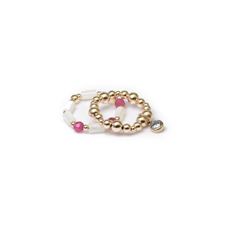 This playful and colourful Candy ring stack was designed using 14k gold filled beads, Tourmaline gemstone beads and white Mother of Pearl beads. Tourmaline is believed to inspire creativity and was used extensively as a talisman by artists and writers. This wonderful bright pink gemstone is also used for safety, grounding and protection, while Mother of Pearl can heighten intuition, psychic sensitivity and imagination. We decorated this ring stack with a Cubic Zirconia charm for extra dazzle and shine.