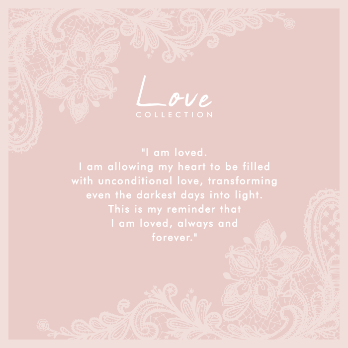 "I am loved. I am allowing my heart to be filled with unconditional love, transforming even the darkest days into light. This is my reminder that I am loved, always and forever."