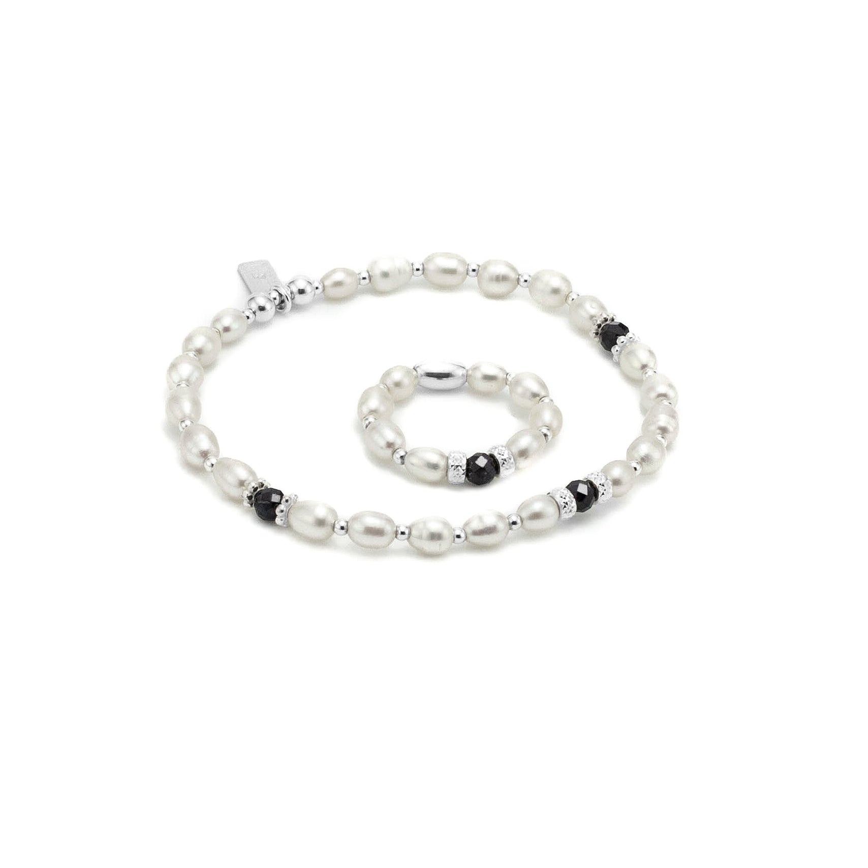 Featuring timeless freshwater pearls and sapphires stones, this elegant bracelet and ring set embodies classic sophistication.