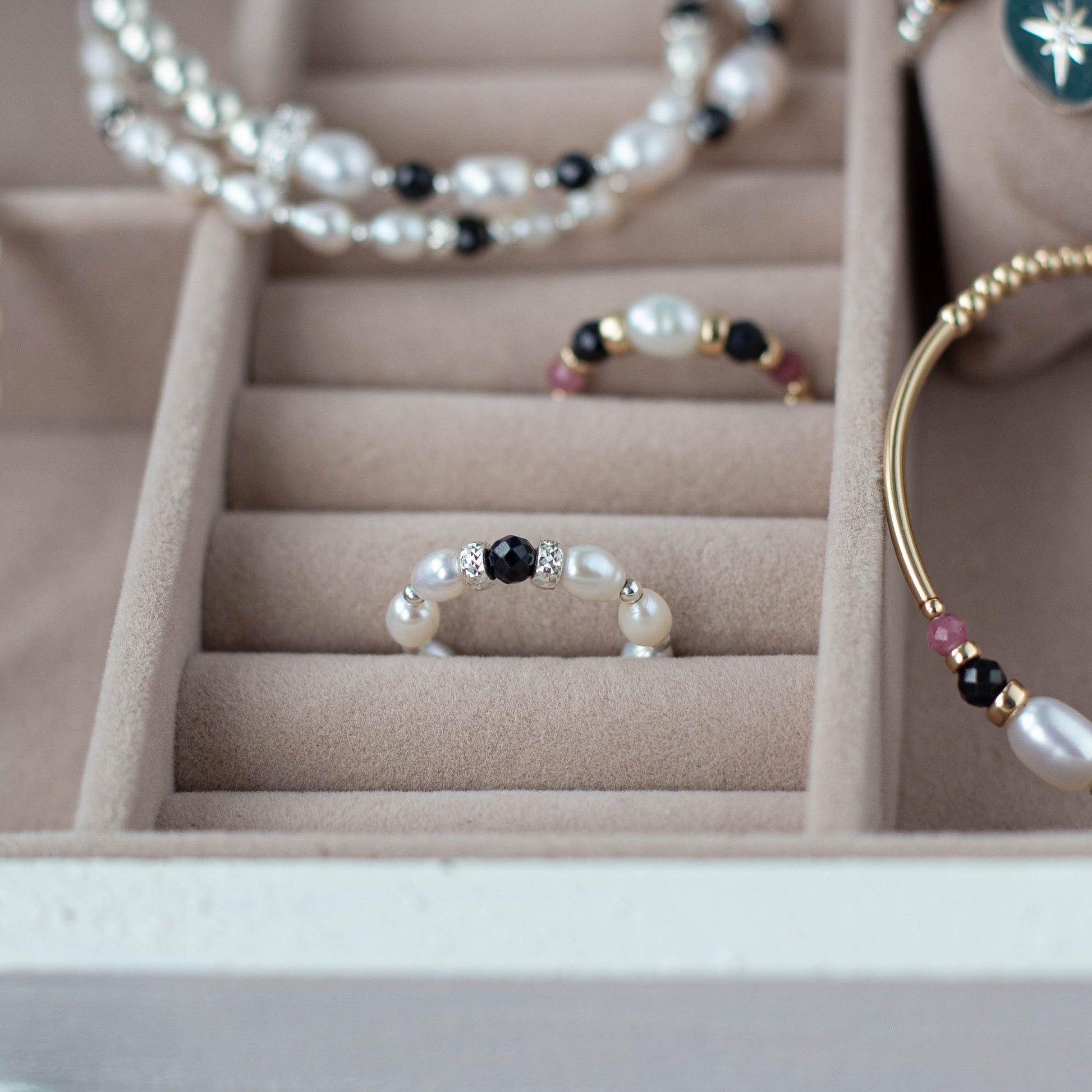 The calming energy of pearls combined with sapphire's deep wisdom, enhances both tranquility and insight, adding a touch of sophistication to your stacking collection