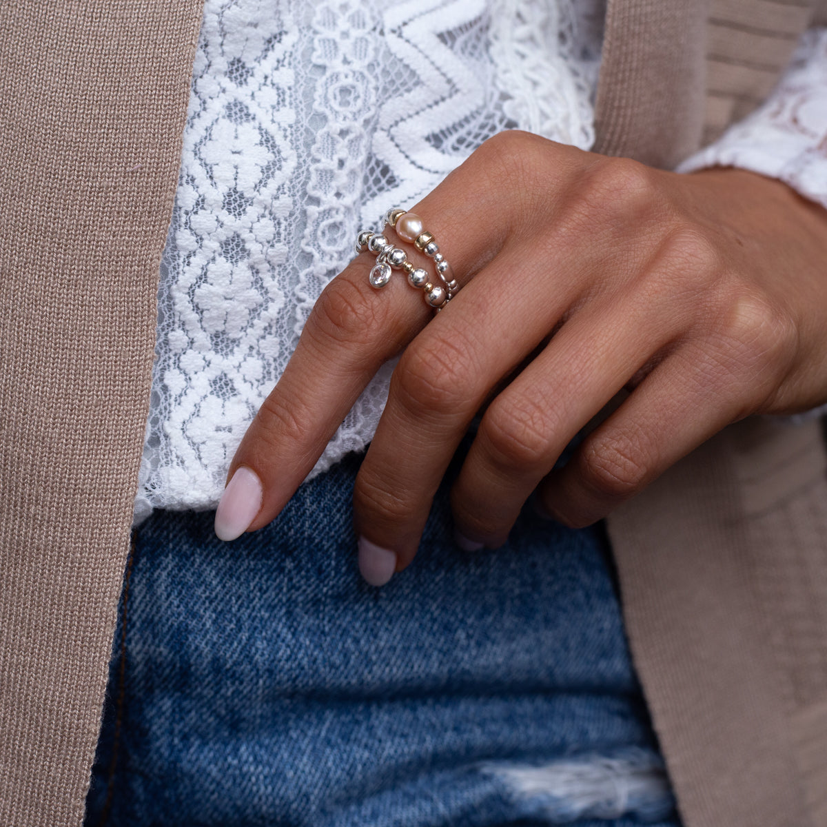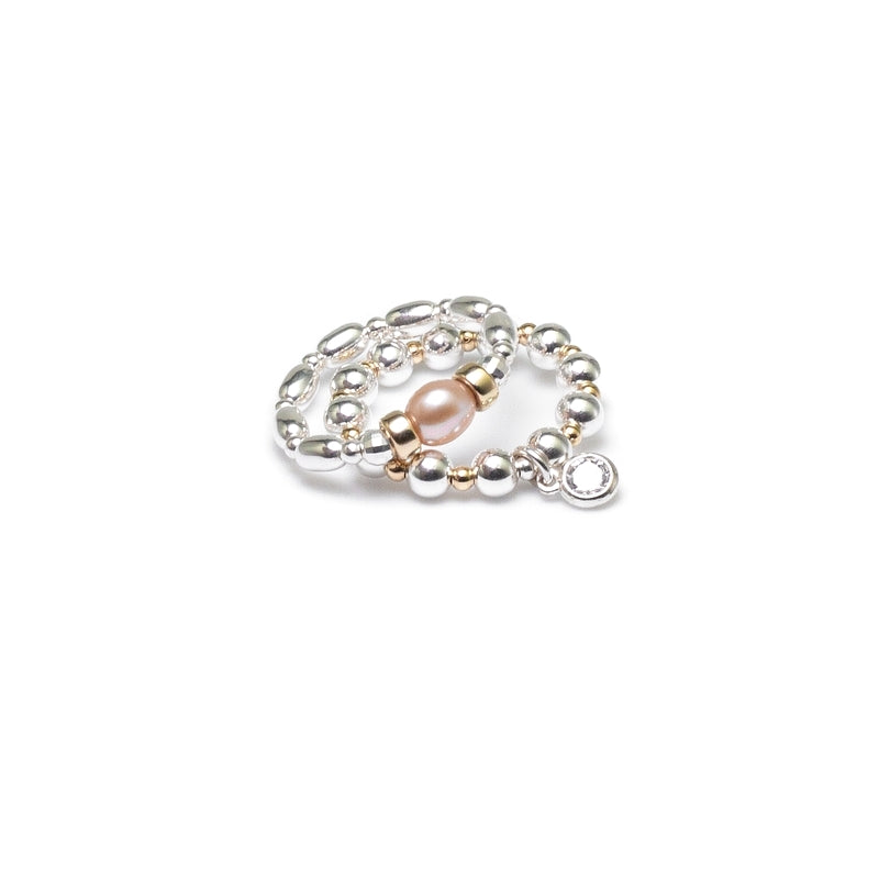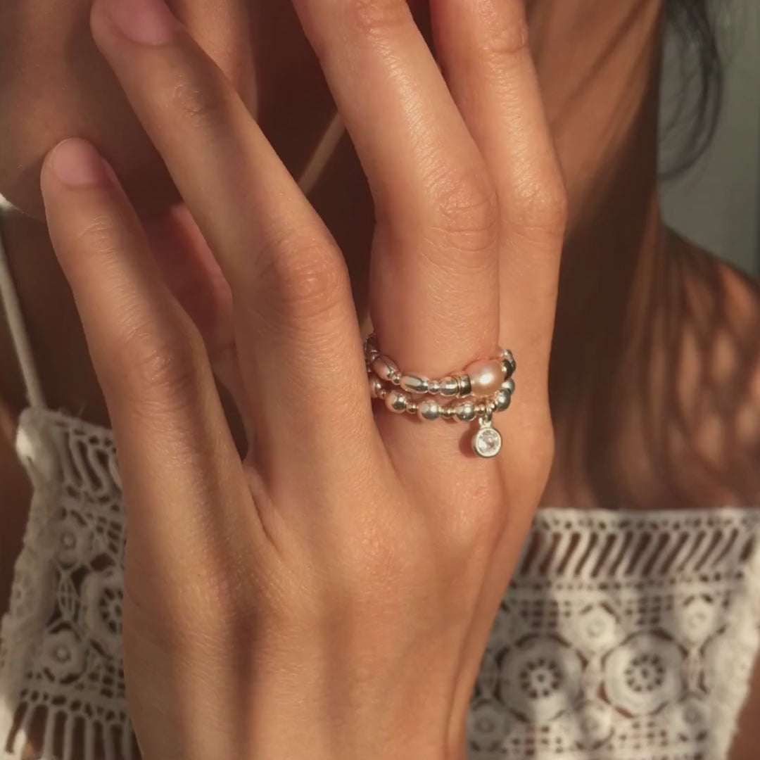 Peach Freshwater pearl ring stack with Cubic Zirconia charm