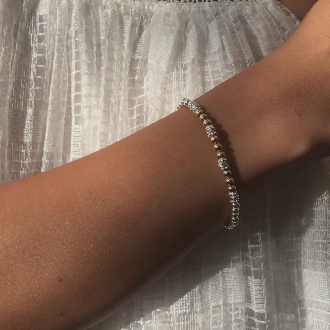 This delicate silver stacking bracelet, adorned with shimmering 14k gold filled beads, beautifully captures the spirit of abundance. Its lightweight design makes it perfect for layering, while each bead represents the flow of wealth and prosperity in your life. Wear it as a reminder that abundance is your birthright, and let its elegance inspire confidence and joy in every step you take.