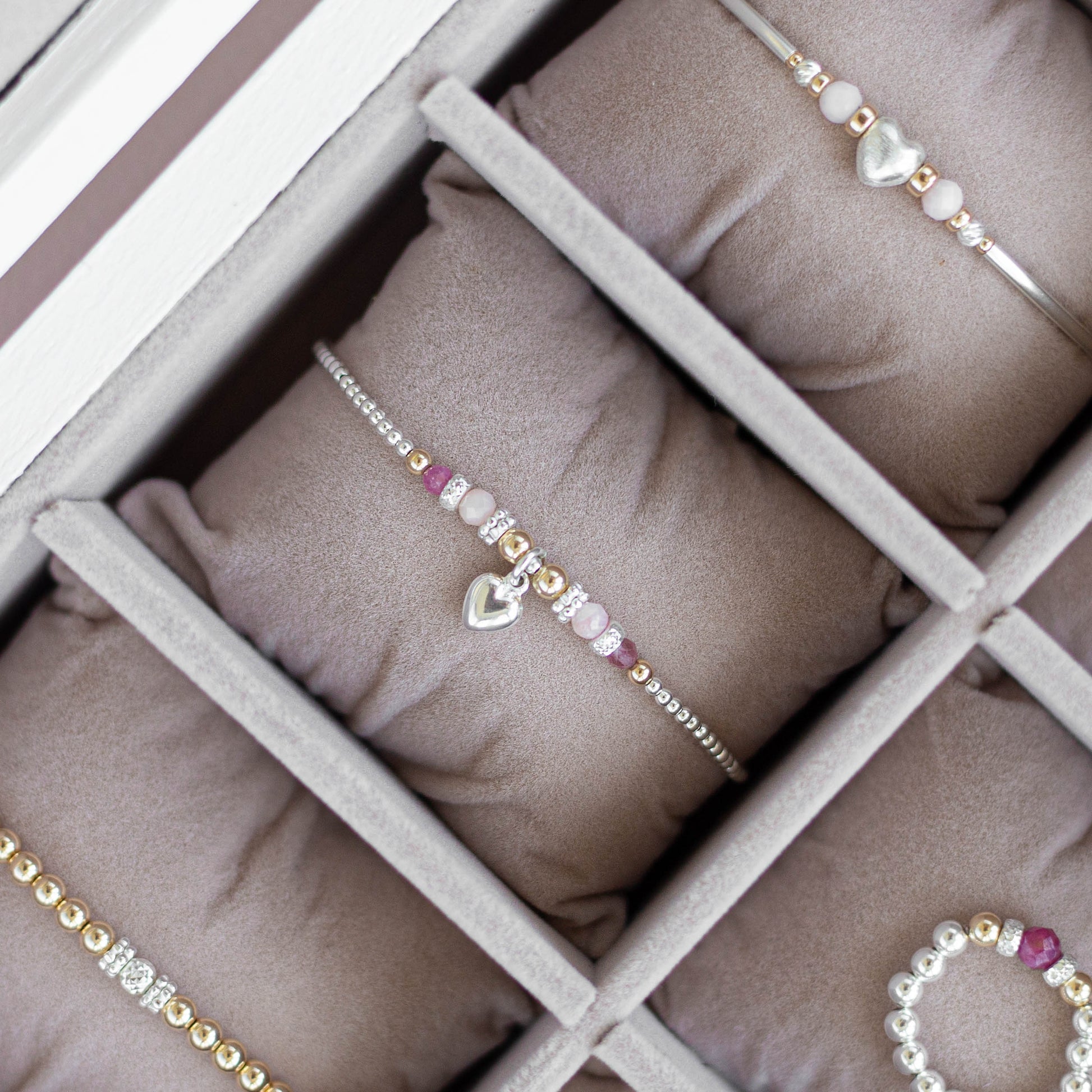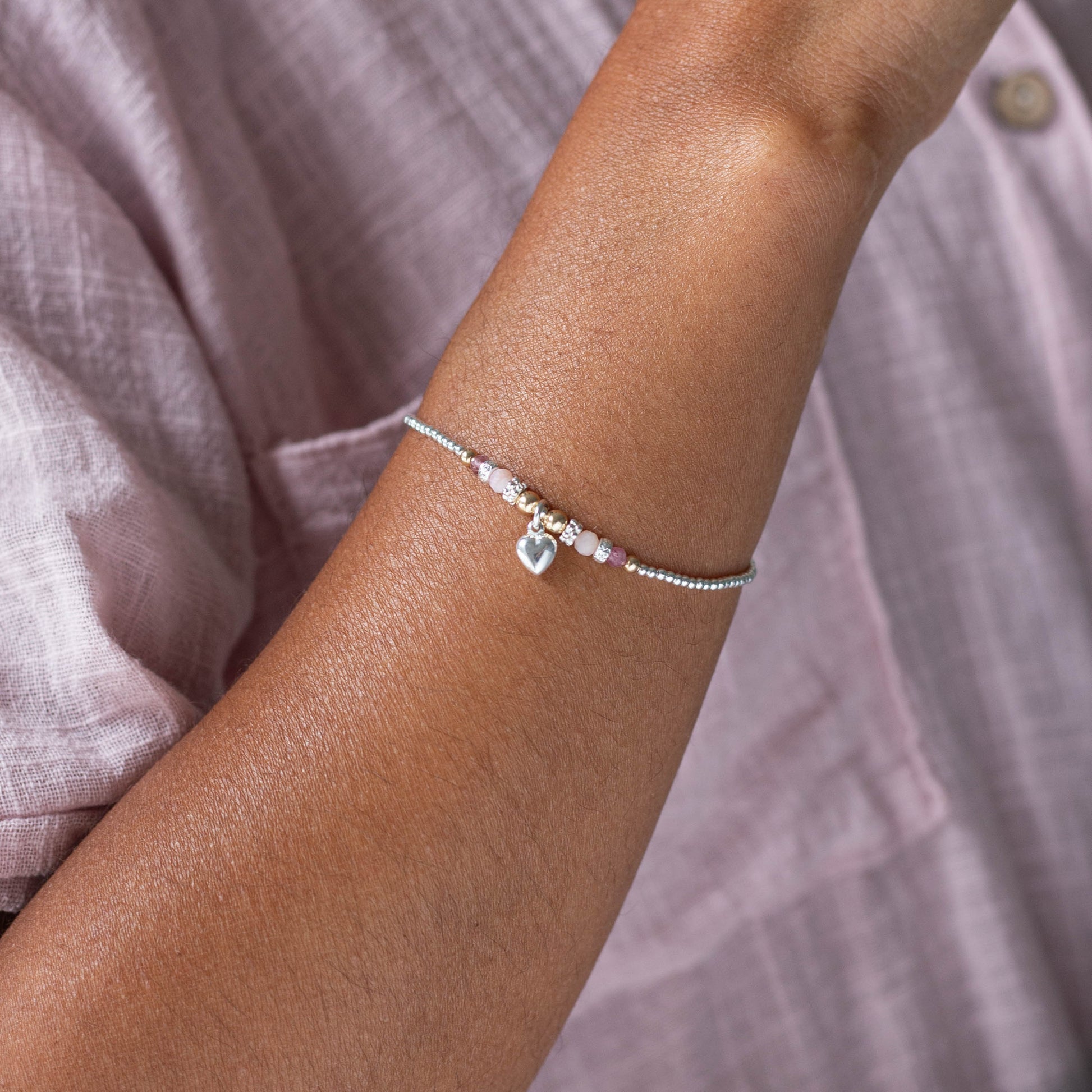 Delicate Heart bracelet with Pink Opal, Tourmaline and 14-karat gold