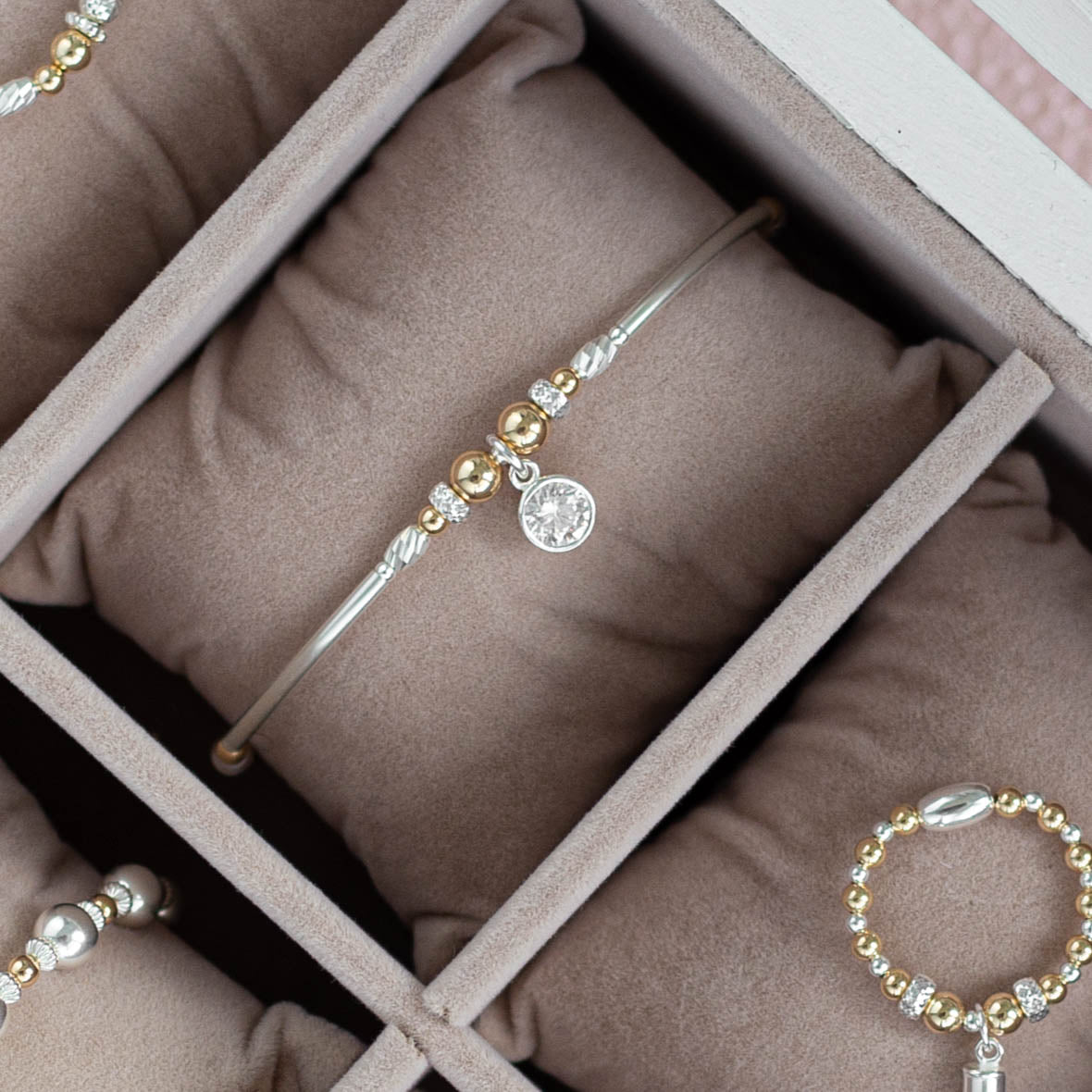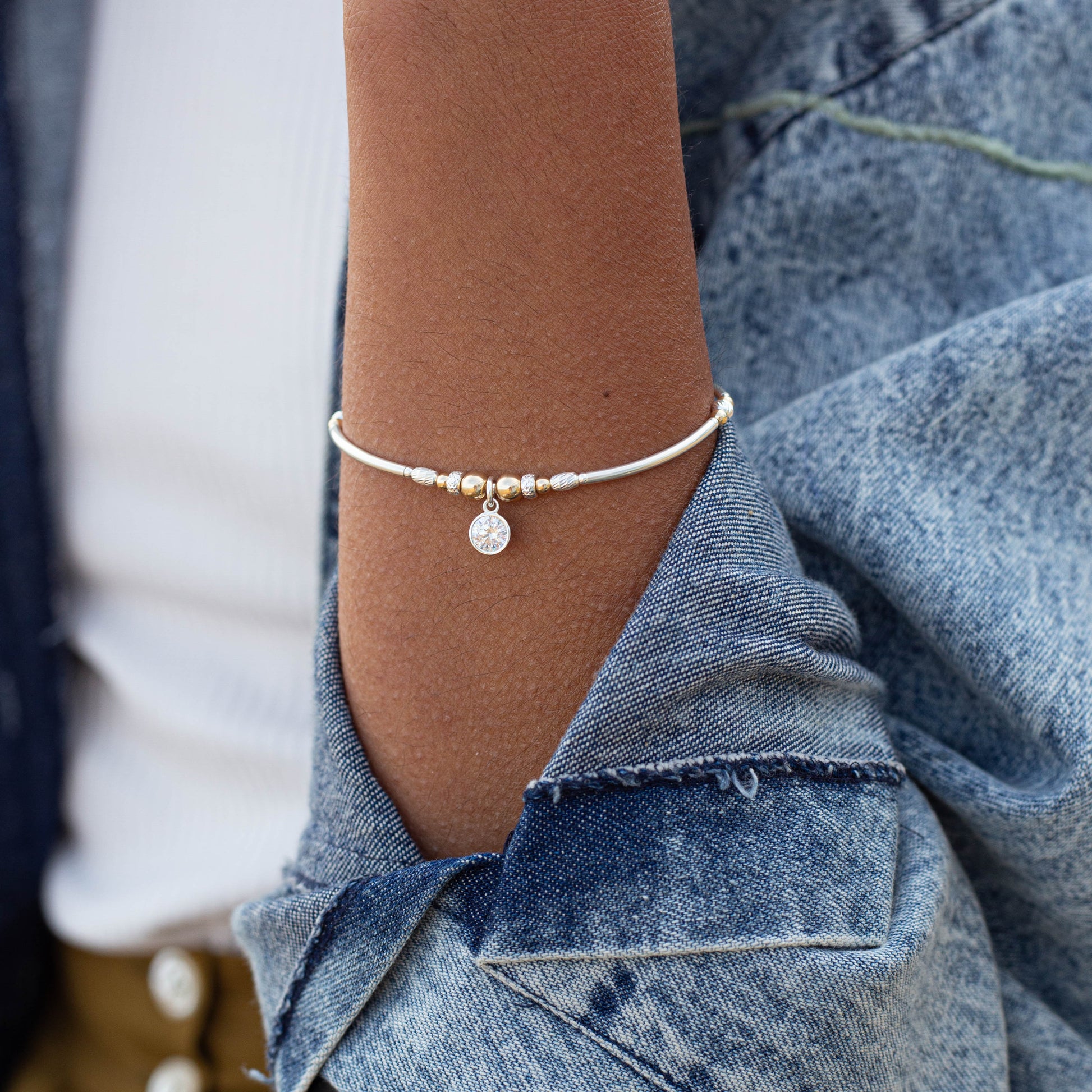 This luxurious gold and silver bangle features radiant cubic zirconia charms that beautifully catch the light, symbolizing abundance and prosperity. Designed as a personal talisman, this piece inspires confidence and attracts positive energy, reminding you of your limitless potential and all that you can achieve.