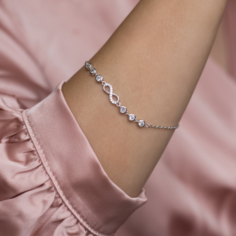 This highly elegant 925 sterling silver sparkling bracelet combines a delicate silver chain and an infinity charm decorated with Cubic Zirconia stones which guarantee all-day sparkle and shine. The infinity symbol implies that something will last forever, whatever it may be, which makes it a perfect gift for loved ones to signify love that never ends. The bracelet has Rhodium plating to enhance the luster and durability of sterling silver and is fastened with an easy-to-use lobster clasp and is easily adjustable to any size of the wrist.