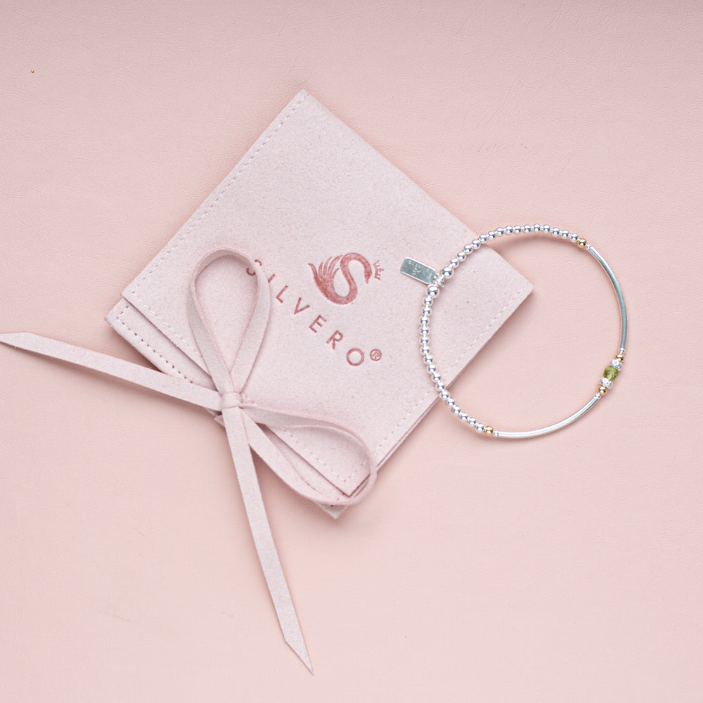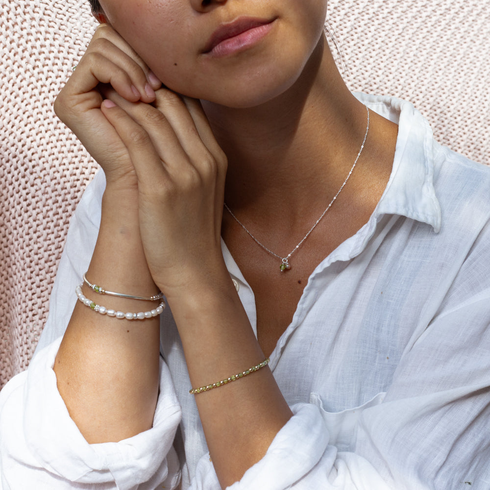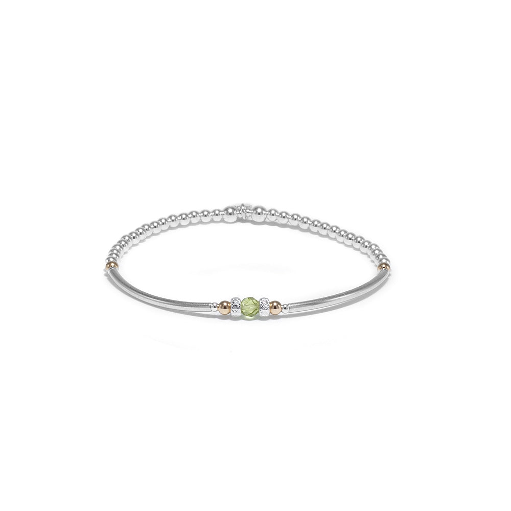 Indulge in the ultimate luxury with our Elegant Tube Silver Bracelet, adorned with a radiant Peridot gemstone and accentuated by dazzling multicut silver beads. This exceptional piece also features carefully placed 14k gold filled beads, adding an extra touch of opulence and sophistication. The sleek tube silver design exudes modern elegance, while the vibrant green Peridot gemstone, associated with August birthdays, symbolizes growth and renewal. The combination of the glistening silver beads and the luxurious gold filled accents creates a truly captivating and luxurious aesthetic. Elevate your style with this exquisite bracelet, a testament to refined beauty and timeless allure.