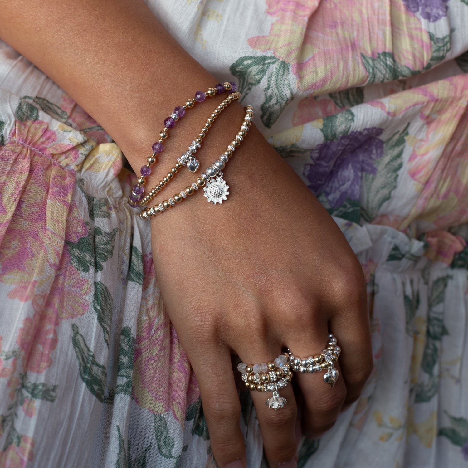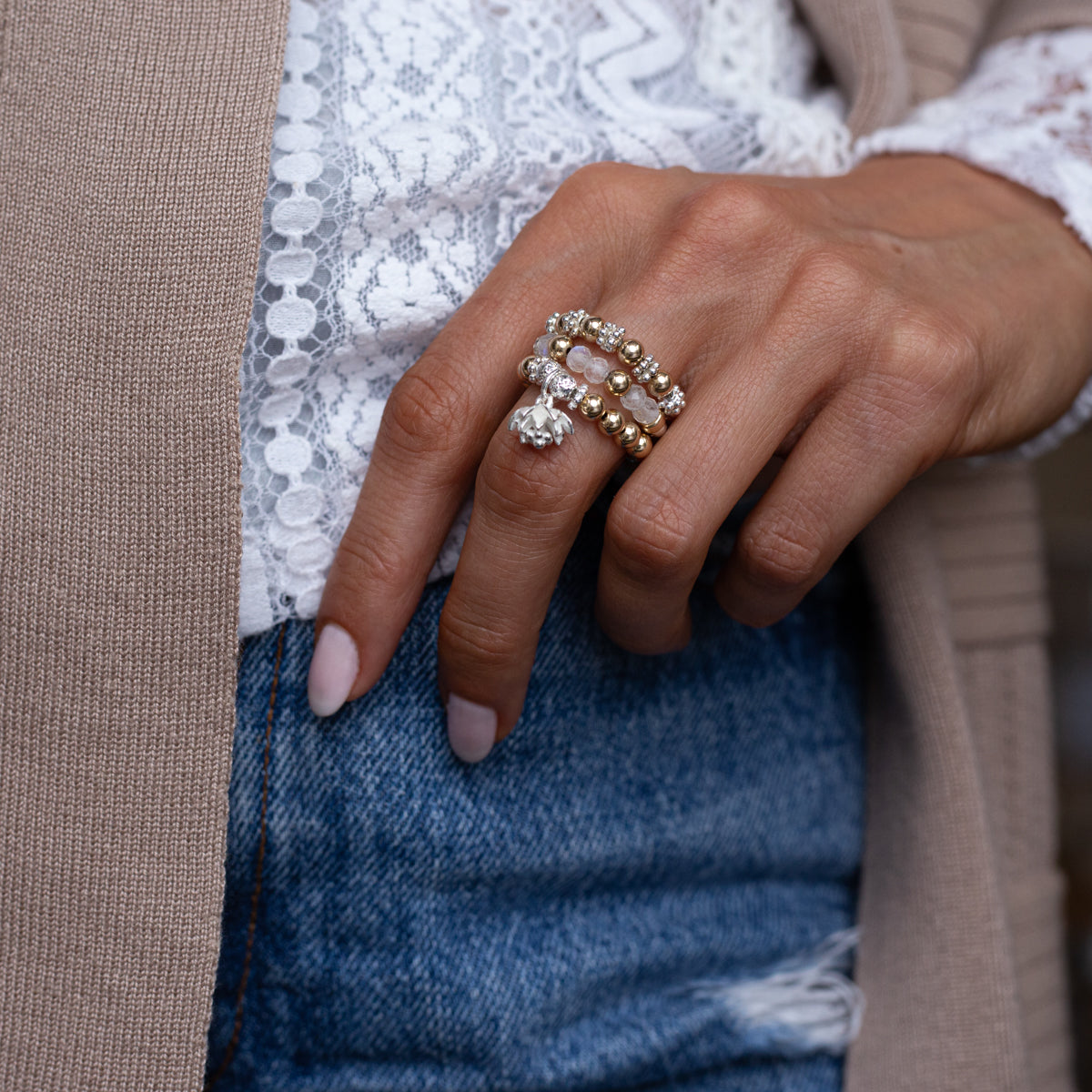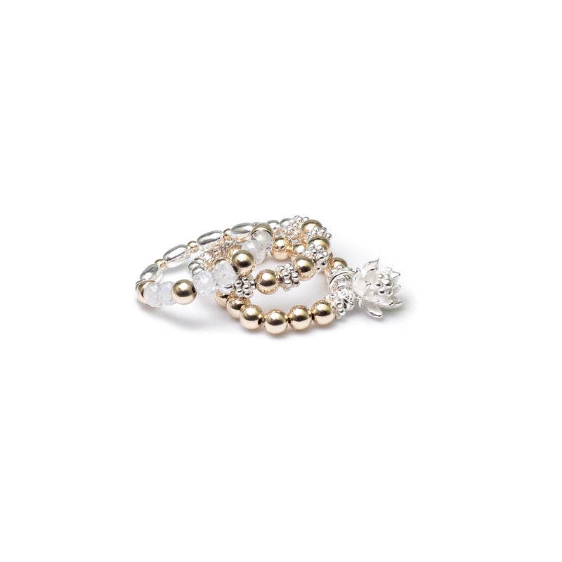 This stunning Golden Lotus ring stack was created as a symbol of New happy beginnings. A beautiful Lotus charm represents rebirth and strength. In combination with Moonstone gemstone that represents action, adventure and grounding this Golden Lotus stack is a perfect accessory for those who decided to step into a new journey. Moonstone gemstone can also help with soothing emotional instability and stress and stabilising emotions.