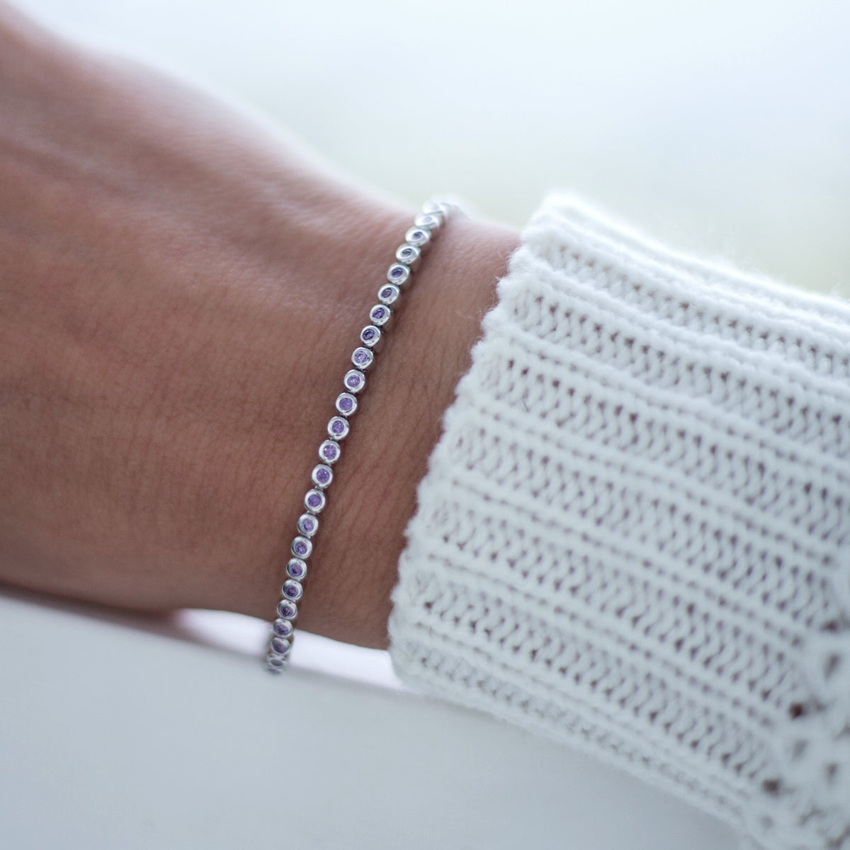 This highly elegant 925 Sterling silver bracelet decorated with violet Cubic Zirconia stones is a very dainty piece with lots of sparkle. The bracelet was designed for everybody, who thinks that less is more. This bracelet has Rhodium plating to enhance the luster and durability of sterling silver.