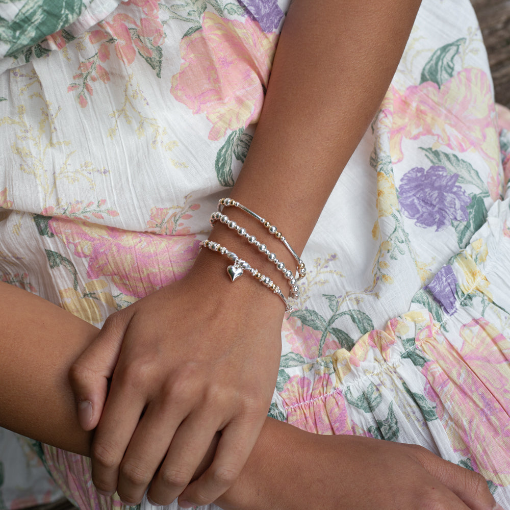 Embrace the essence of infinite love with this stunning bracelet stack, crafted from 925 sterling silver and adorned with 14-karat gold accents. This set includes three beautifully designed stacking bracelets, each featuring a charming heart symbol to remind you of the love that surrounds you. Perfect for everyday wear or special occasions, these bracelets will elevate your style while serving as a powerful affirmation of the unconditional love you deserve. Wear them together or separately to express your unique style and connection to love.