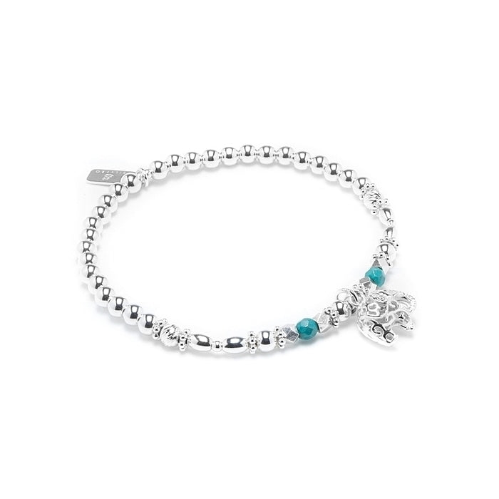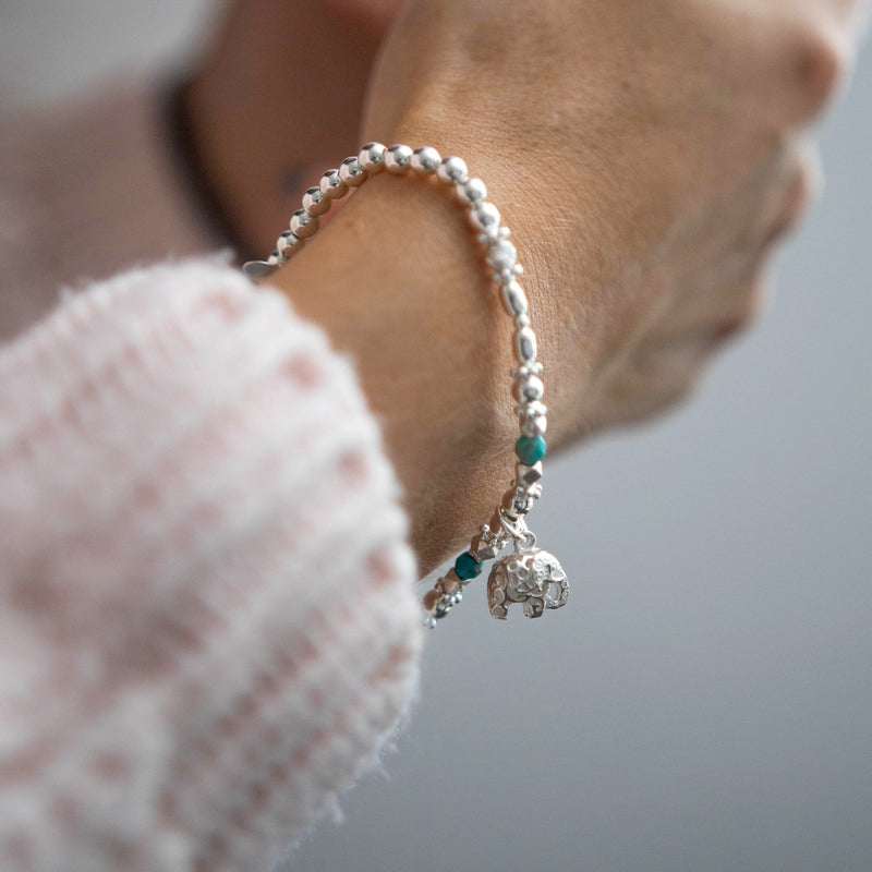 Oriental 925 sterling silver stretch stacking bracelet with Elephant charm and Turquoise gemstone
