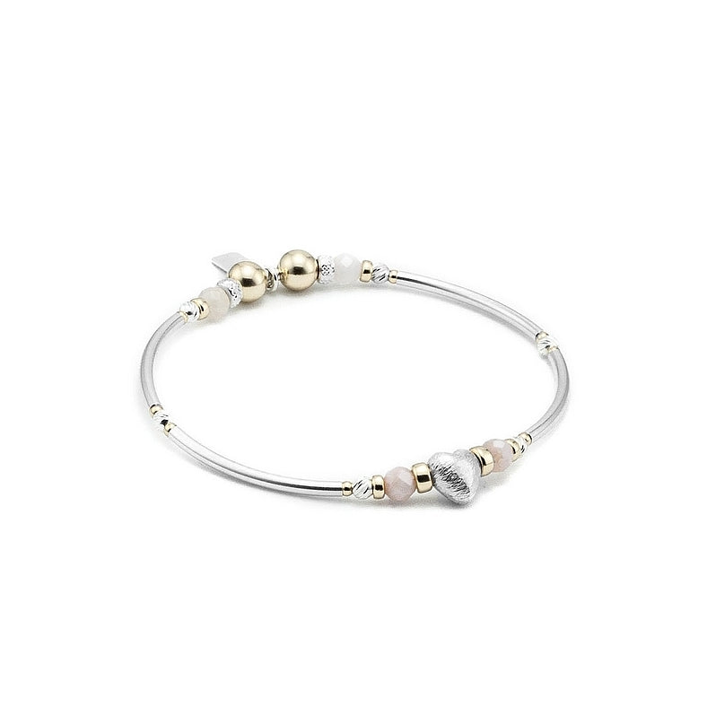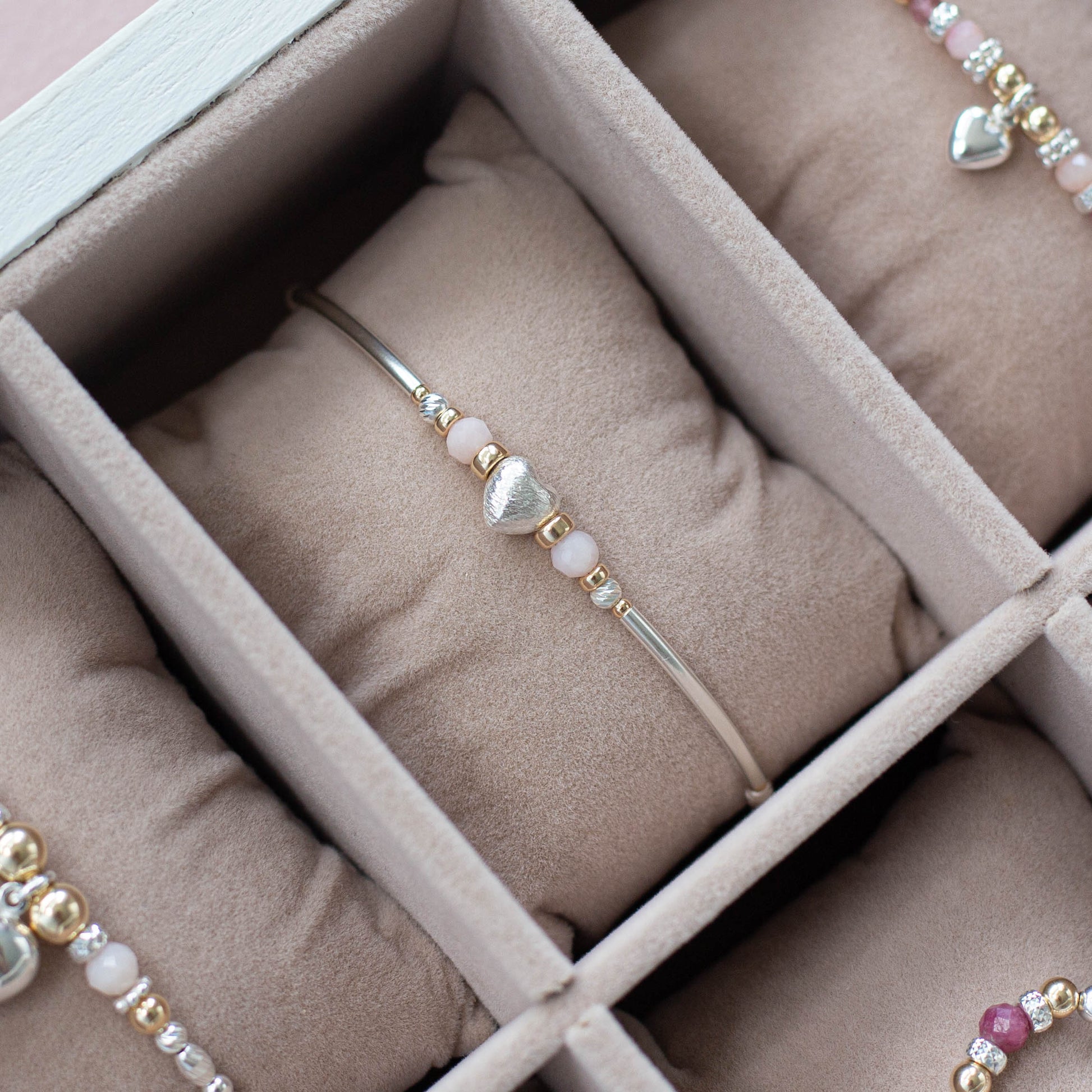 Silver Bangle Heart bracelet with Pink Opal and 14-karat gold